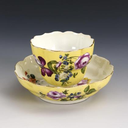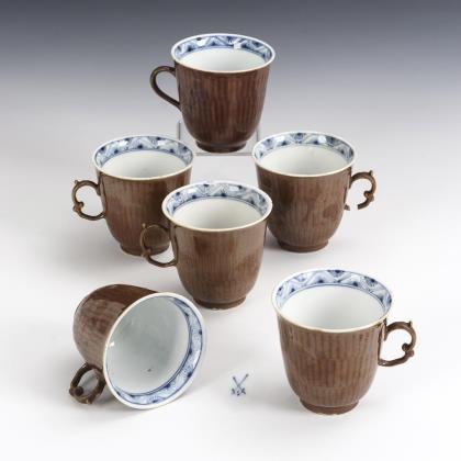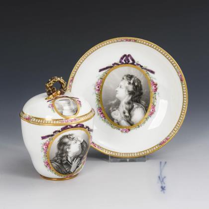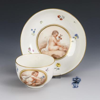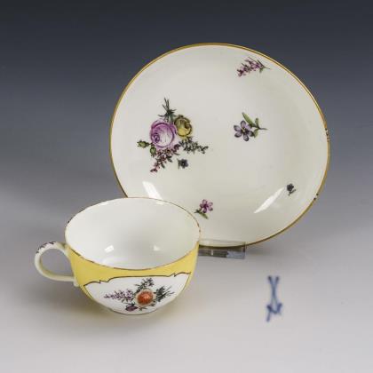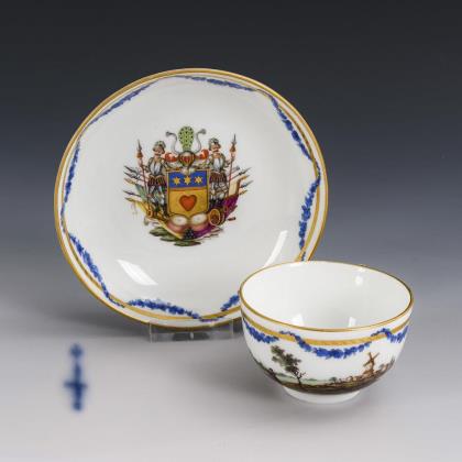Bauchige Tasse mit Ohrenhenkel. Unter einer blauen Blütengirlande die Darstellung einer Flusslandschaft mit Mühle und Personenstaffage (Tasse) bzw. des von Trophäen umstandenen und von zwei Rittern flankierten Wappens der Adelsfamilie von Liphart (Untertasse)