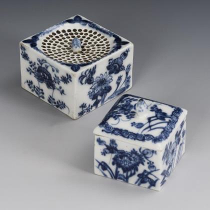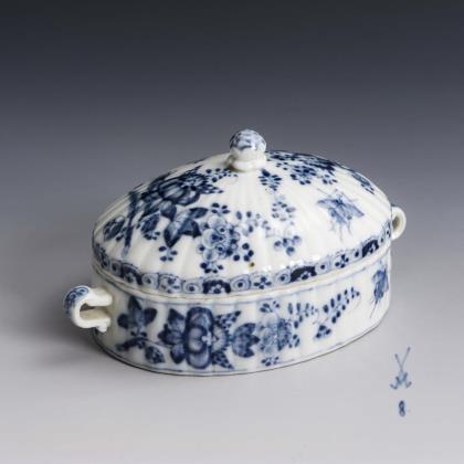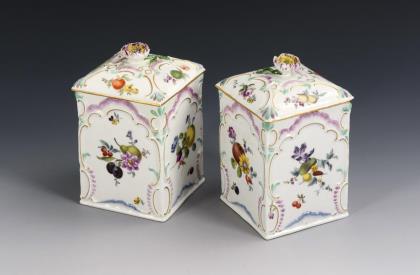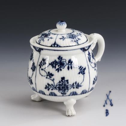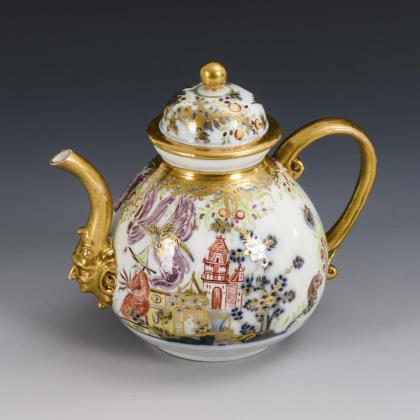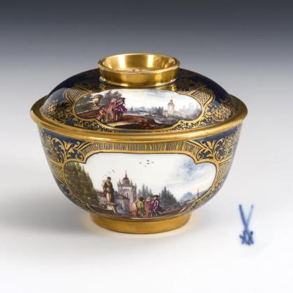 Allseits feine farbige Bemalung mit sechs verschiedenen Chinoiserien nach Johann Gregorius Höroldt. Umlaufend reliefierte Akanthusblatt-Bordüren mit vergoldeten Rippen. Vergoldete Metall-Montierung mit Haubendeckel. Unglasierter Boden, Formerzeichen von Caspar Meißner senior (1689 Scharffenberg - 1751 Meißen), Mitarbeiter von Johann Friedrich Böttger. Schwertermarke