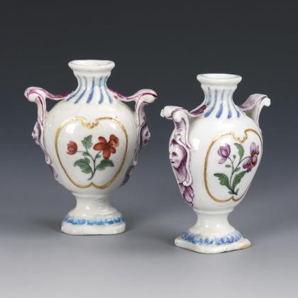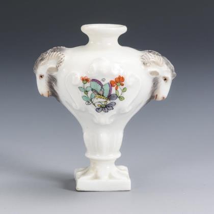 Miniatur-Widderkopfvase. Meissen. Ungemarkt, 18. Jh. Polychrom bemalt. H 6 cm. Balusterväschen mit zwei Widderkopfhandhaben und Kakiemonmalerei. Hals restauriert.