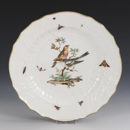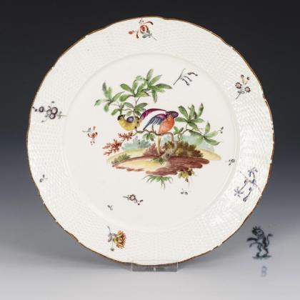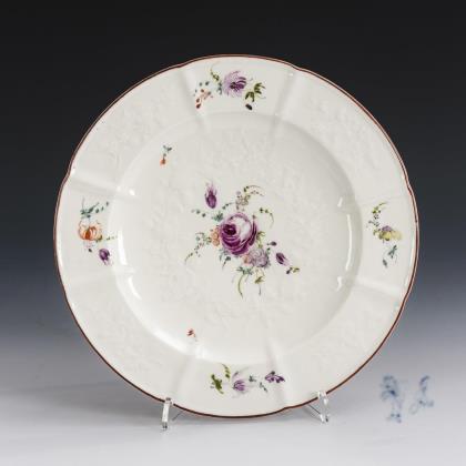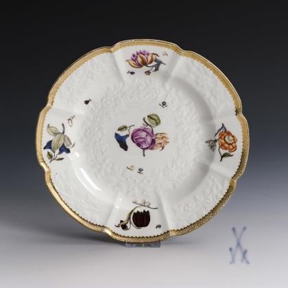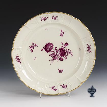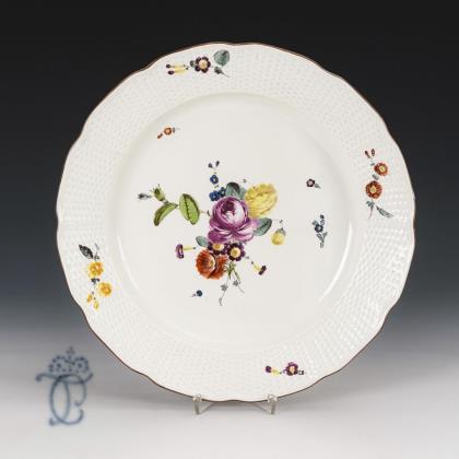 Speiseteller mit dem Reliefdekor "Gotzkowsky". Im Spiegel ein fein gemaltes Blumenbukett mit Rose, auf der Fahne verschiedene Blumenstängel