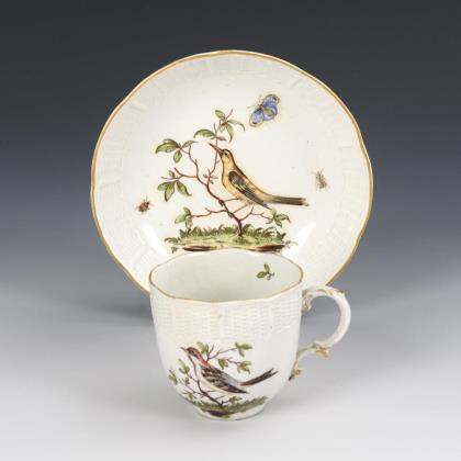 Mit dem Reliefdekor "Altozier", Tasse mit Rocaillehenkel. Schauseitig auf der Tasse sowie im Spiegel der Untertasse Vogel- und Schmetterlingsmalerei