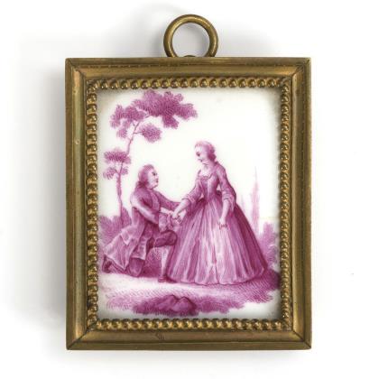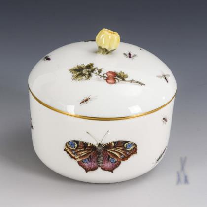 Allseits feine farbige Bemalung, umlaufend und auf dem Deckel Watteau-Szenen, im Deckel Dame mit Vogelbauer, auf dem Außenboden Rundreserve mit Landschaft in eisenroter Camaieumalerei, gerahmt von einer aufwendigen, gold schattierten Kartusche, innen Goldfond. Spätere Montierung mit Scharnier und Daumengriff, ohne Marke