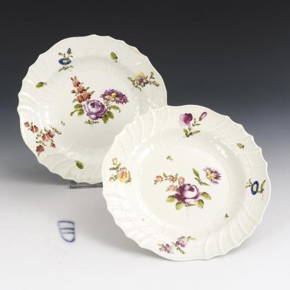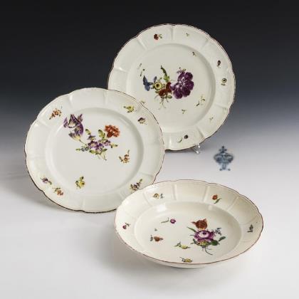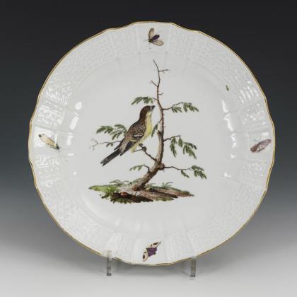 Reliefdekor "Altozier". Modell von Johann Joachim Kaendler und Johann Friedrich Eberlein 1735. Farbige Blumenbemalung, kapuzinerbraun staffierte Ränder. Pressmarken, Schwertermarken