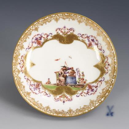 Seegrüner Fond. Beidseits passig geschweifte Goldreserven mit feiner farbiger Bemalung, "Galante Paare in Landschaft" nach französischen Kupferstich-Vorlagen, innen Goldspitzenbordüre. Ritzmarke IZ, Schwertermarke