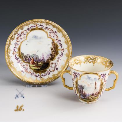 Feine farbige Bemalung, beidseits große Kartuschen mit Lüsterfond und Bandelwerk in Purpur, Eisenrot und Gold mit Hafenszenen nach Johann Gregorius Höroldt. Seitlich indianische Blütenzweige. Goldspitzenbordüre, Goldstaffage. Formerzeichen von Johann Christian Dietrich, 1698 Dommitzsch - 1757 Meißen, Ehemals goldene Malermarke, Schwertermarke
