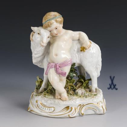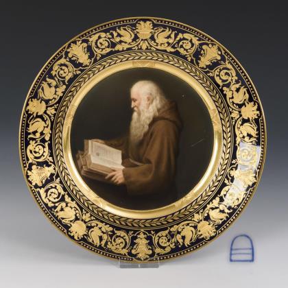 Feine farbige Bemalung nach der Gemälde-Vorlage von Heinrich Ferdinand Hofmann (1824 Darmstadt - 1911 Dresden). Das Gemälde hängt in der Gemäldegalerie Neue Meister in Dresden. Signiert: L. Sturm. Unglasierter Boden, Pressmarke, Ritzmarke. Profilierter Waschgoldrahmen