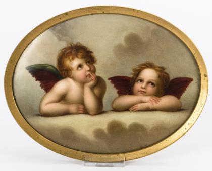 Ovale Plakette mit der Darstellung der zwei Puttenfiguren auf Wolken, nach den beiden, seit etwa 1800 losgelöst vom Herkunftswerk rezipierten Engel aus dem Gemälde "Die Sixtinische Madonna" von Raffael (1483-1520)