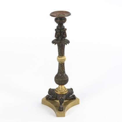 Paar Biedermeier-Kerzenleuchter im Empire-Stil. 1830/40. Frankreich. Bronze teils dunkelbraun patiniert, Messingblech. H 31 cm. 3 Tatzenfüße mit Blattzier auf 3-seitiger Plinte, Säulenschaft mit Blattzier am Ansatz sowie blattverzierte Vasentülle. Einige Risse und Beulen an den Säulenschäften aus Blech, 1x Schiefstand.