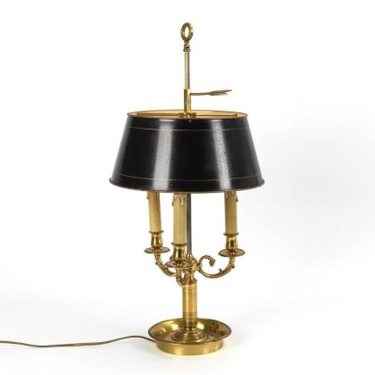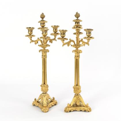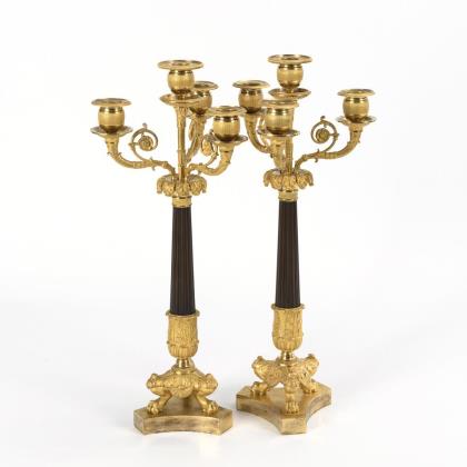 Paar 4-flammige Kandelaber. Um 1870. Bronze vergoldet, schwarzer Marmor. Kerzenleuchter mit Klauenfüßen, kurzem Marmorschaft und hohem Strebeaufsatz mit gestuft angebrachten Tüllen. 1 Tülle alt ergänzt, minimale Alters-/Gebrauchsspuren.