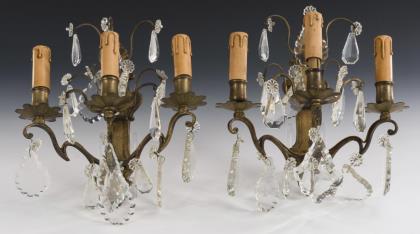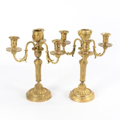 Paar 3-flammige Leuchter im Louis-Seize-Stil. Um 1900. Bronze. H 27,5 cm (ohne Fassungen). Im Barock-Stil gestaltete Leuchter mit Volutenarmen am köcherartigen Schaft. Elektrifizierung mit Holz-Schraubfassungen und -Kerzenhülsen 1x entfernt, Verkabelung erneuert.
