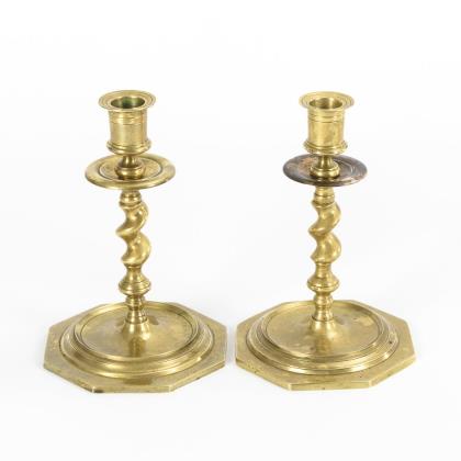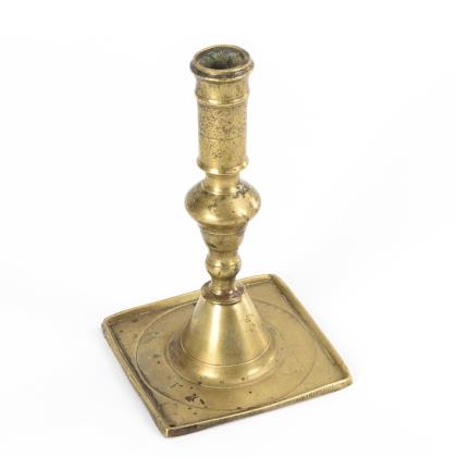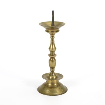 Glockenleuchter. Ende 17. Jh(?). Bronze. H 33 cm. Massiver Kerzenleuchter mit gedrücktem Glockenfuß und Schulterscheibe als Tropfteller. Schlanker Balusterschaft mit Bronzedorn in der weiten Tülle. Gewinde im Fuß und Dorngewinde verlötet, Alters-/Gebrauchsspuren.