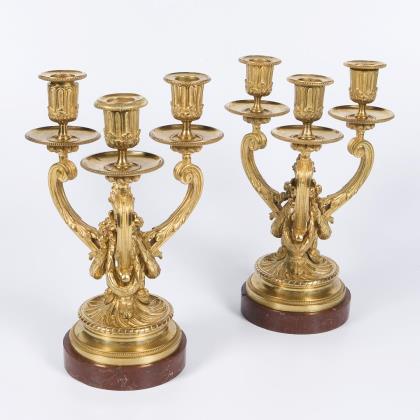 Im Stil von Jean Charles Delafosse (1734-1789, Ornamentkünstler, Zeichner, Kupferstecher, Architekt). 3-flammige verschraubte Standleuchter mit volutenförmig geschwungenen Leuchterarmen und wuchtigen Lorbeerblatt-Festons auf Bocksbeinen. Schaft mit Fammenbekrönung. Stufig abgesetzter Standfuß mit ornamentalem Dekor. Rotbraune Marmor-Plinthen