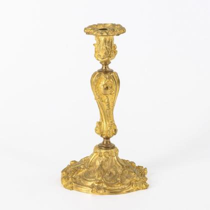 Paar Kerzenleuchter. Spätes 19. Jh. Bronze vergoldet. H 27 cm. Schlanke Bronzeleuchter mit Ornamentgravur auf dem Fuß und vasenartigem Balusterschaft. Teils berieben.
