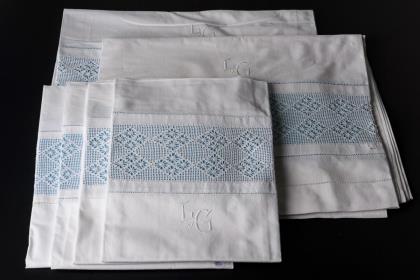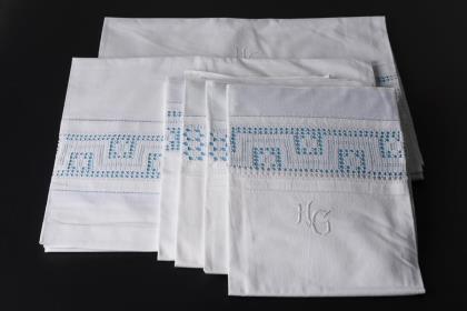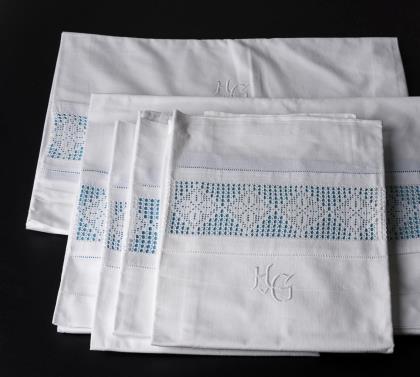 2 Laken und 3 Kissenbezüge mit gehäkelten Ziereinsätzen mit Rautenmuster. Großes, gesticktes Adelsmonogram HvG