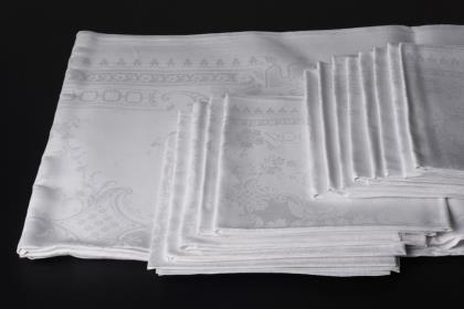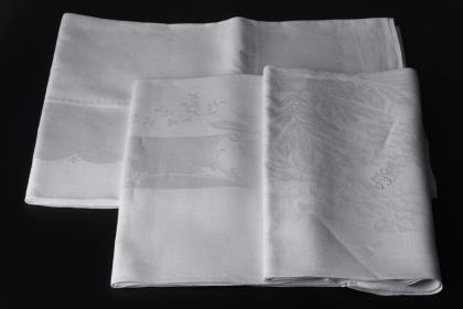 Tuch mit Oval aus Blütengirlandenrispen auf glattem Grund und Tuch mit feinen Blütendekoren. Gesticktes Monogramm AK