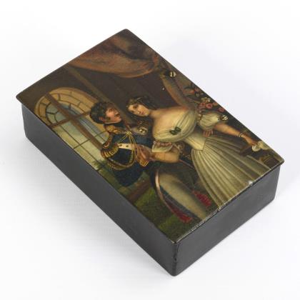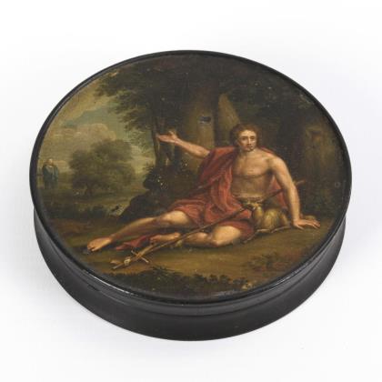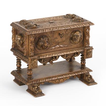 Allseits reich beschnitzte Schatulle mit dem Thema Wasser: Schildkröten-Füße, Schilfwandung mit Vögeln, auf dem Scharnierdeckel lasziv lagernder Knabe mit Fanfare in einer Muschel sowie Quellen an den Ecken. Einige Fehlstellen an den Schildkröten, Anobienspuren