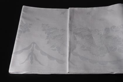 Tuch mit stilisierten Blüten und Rocaillen. Mittig kleine Kornblumensträußchen und Gräser. Gesticktes Monogramm LH