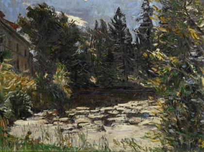 CHEVALIER, Adolf (* 1831 Crossen/Oder). Farmstead on the banks of the stream.