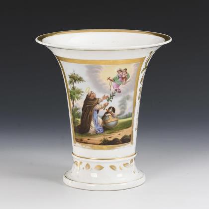 Kratervase, schauseitig eine goldgerahmte Kartusche mit der Darstellung einer Vision des heiligen Dominikus, dem die Muttergottes einen Rosenkranz übergibt. Partiell berieben.