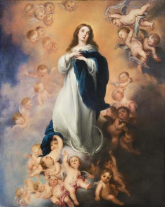 Feine farbige Bemalung nach der Gemälde-Vorlage von Bartolomé Esteban Murillo (1618 Sevilla - 1682 Sevilla). Das Gemälde (274 x 190 cm) hängt im Museo Nacional del Prado in Madrid. Es wurde von Justin de Neve (1625-1685, Sevilla) in Auftrag gegeben. Unglasierter Boden, Pressmarke. Aufwendig gearbeiteter vergoldeter Stuckrahmen mit Holz-Rückwand. Rückseitig niederländische Klebezettel