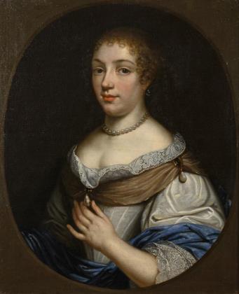 Bildnis einer jungen Frau im seidenen Kleid mit der großen Perle zwischen den Fingern. Leinwand doubliert.