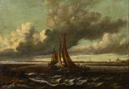 AHA: Jan Frans von Bloemen gen. L'Orrizonte (1662 Antwerpen - 1749 Rom) attr.; Italienische Landschaft mit Hirten vor einem Fluss Blick auf eine baumbestandene, bergige Landschaft mit pittoreskem Architekturensemble, rechts im Vordergrund die vor einem dräuenden Unwetter fliehenden Hirten. In Motiv, Komposition und Stil charakteristisches Werk des flämischstämmigen Malers, der selten signierte. J. F. van Bloemen ging 1689 nach Rom, wo er ein höchst erfolgreicher Maler wurde, der u. a. große Veduten für prominente Auftraggeber wie die Königin von Spanien Elizabeth Farnese, den Papst und den römischen Adel ausführte. Er trat den Bentvueghels als der Vereinigung niederländischer und flämischer Künstler in Rom bei, wo er den Spitznamen Orizzonte erhielt. Mit Vorliebe schilderte der Künstler die Campagna-Landschaft in idealisierender Weise mit Ruinen, Wasserfällen, Brücken und Hirten. Beeinflusst durch Claude Lorrain und Gaspard Dughet, kam er letzterem bald im Ruhm gleich. Werke besitzen u. a. die Eremitage, der Louvre und die Staatl. Kunsthalle in Karlsruhe. Öl/Lwd., doubl; Rahmen. Verso altes Etikett mit Zuschreibung u. Bez. "Nro. 36 (/) Bloemen, Jan Frans (/) 1662 - 1749 Flämische Schule (/) Erworben 1923 Auktion Frankfurt". 58 cm x 73 cm. Barock-Rahmen. Attributed to Jan Frans van Bloemen (1662 - 1749). Oil on canvas, relined. Inscribed with attribution and provenance (purchased 1923 in an auction in Frankfurt) on an old label on the reverse. Benötigen Sie Hilfe ? Kontaktieren Sie die Kundenbetreuung Antiques Trade Gazette