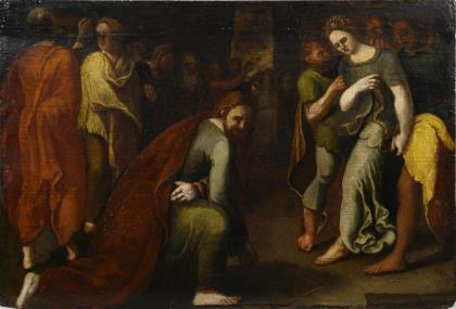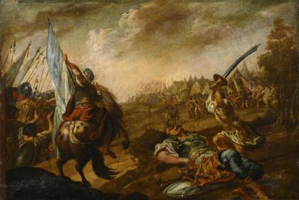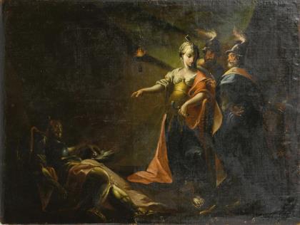 Barocker Maler: Jaël und Sisera Öl/Leinwand. Unsigniert. Um 1700. 68 x 92,5 cm. Gerahmt 80 x 105 cm. Zwei Soldaten im Gespräch mit der jungen Frau, welche auf den ermordeten Soldaten zeigt Leinwand doubliert. Wohl Umkreis Franz Sigrist (1727 Breisach - 1803 Wien), 2. H. 18. Jh.