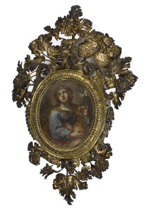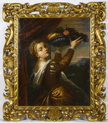 Copy after Titian "Girl with fruit bowl" in magnificent carved gold frame.