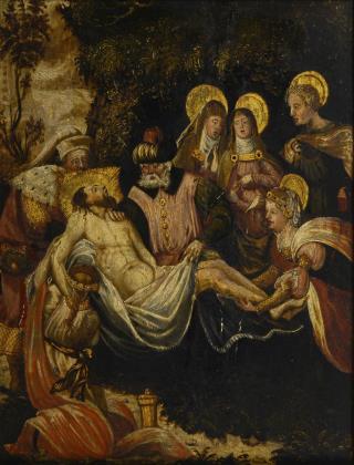 Kleinformatige, vielfigurige und detailreiche Darstellung nach einem flämischen Altmeister. Breiter Flammleistenrahmen