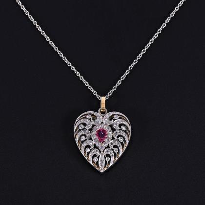 Medallion heart pendant with ruby and diamond roses on chain.