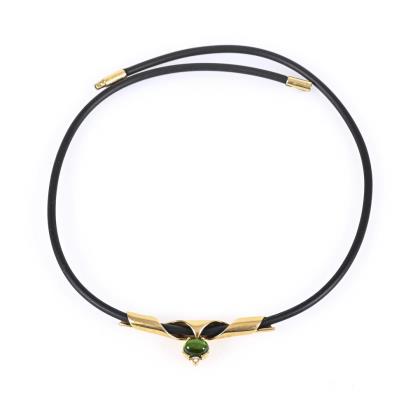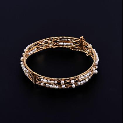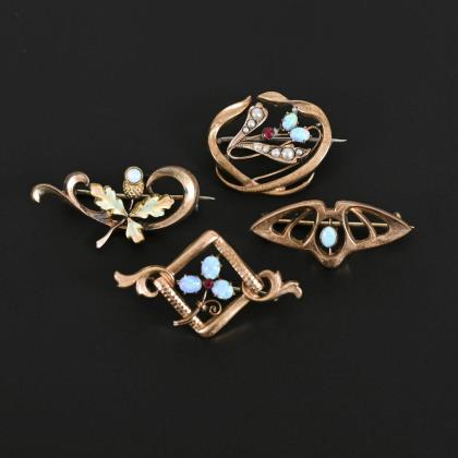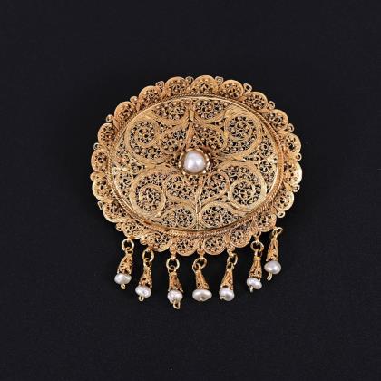 Floral durchbrochen gearbeitet. 9 Perlchen, 1 gelbgrüner Turmalin. Punzen: Feingehalt