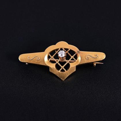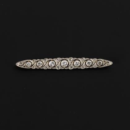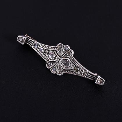 Durchbrochen gearbeitete Stabform. 7 Diamanten circa 1 ct, 16 kleine Diamantrosen. Ohne Punzen, Feingehalt mit Säure geprüft