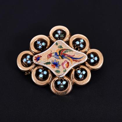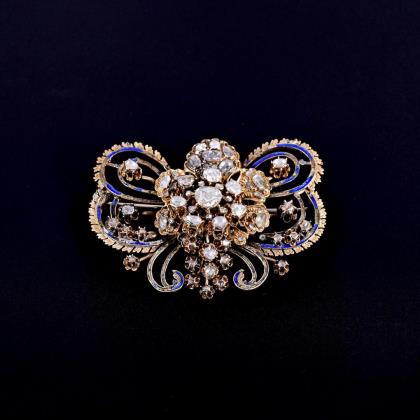 Antique brooch with old cut diamonds and enamel in blue case.
