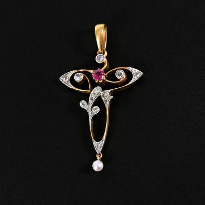 Art nouveau pendant with ruby?, old cut diamonds and pearls.