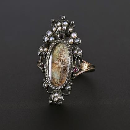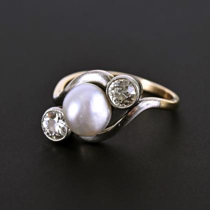 Art deco ring with old cut diamonds and cultured pearl.