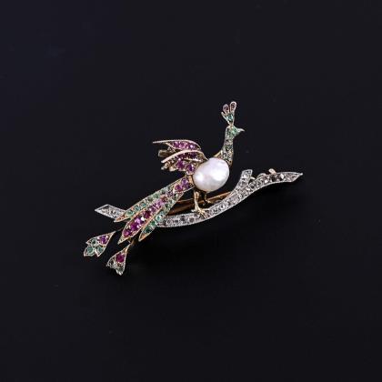 Peacock brooch with various stones and cultured pearl| see addendum.