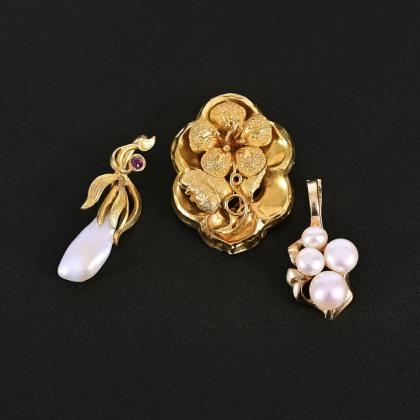 Floral durchbrochen gearbeitet, mit kleiner Abhängung. 7 Perlchen, 1 ovaler, 1 runder Rubellit. Ohne Punzen, Feingehalt mit Säure geprüft