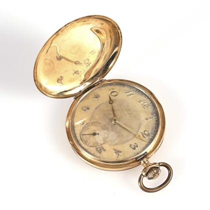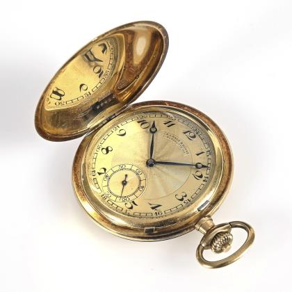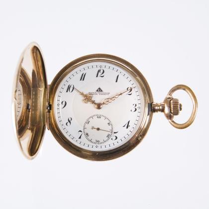 Werk, Gehäuse und Zifferblatt signiert. Gold-Innendeckel. Vergoldetes Dreiviertel-Platinen-Ankerwerk mit gebläuten Stahlschrauben, Schwanenhals-Feinregulierung, zwei verschraubte Chatons. Weißes Emailzifferblatt, schwarze arabische Zahlen, kleine Sekunde, durchbrochen gearbeitete Zeiger. Rückseitig auf dem Deckel gravierte Widmung: C. Jörg Wenner 2.5.1971. Kronenaufzug