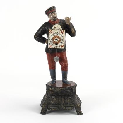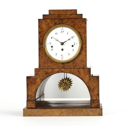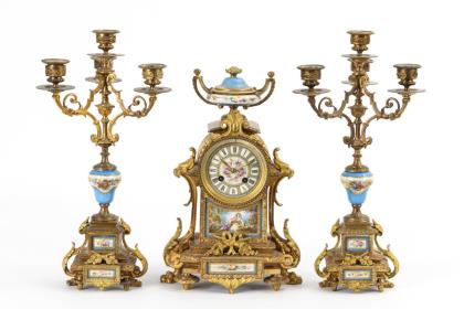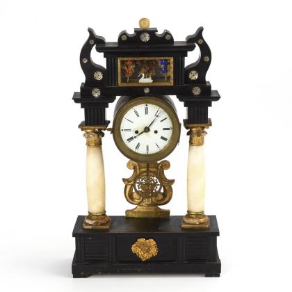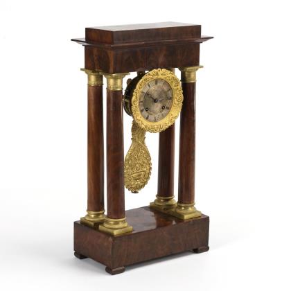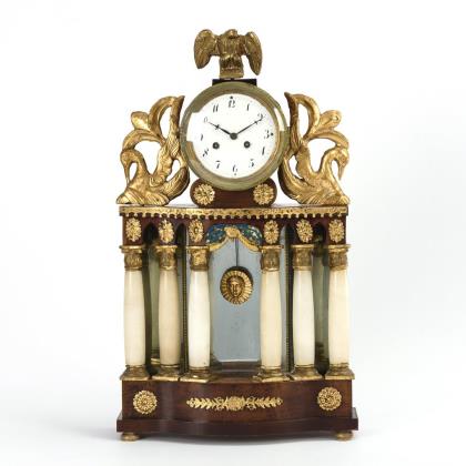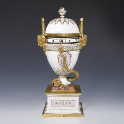 Bronze, Messing, vergoldet. Porzellan mit Sepia-Bemalung, partiell reliefiert, roséfarben und gold staffiert. Beidseits Ovalreserven mit mythologischen Göttinnen der Jugend und der Gerechtigkeit, marmorierte Plinthe. Horizontaler Stundenziffernring, darüber Minutenziffernring, weiße Emailplaketten mit schwarzen römischen und arabischen Zahlen. Als Zeiger fungiert die Zunge der Schlange. Ankerhemmung, Schloss-Scheibenschlagwerk. Bodenmarke