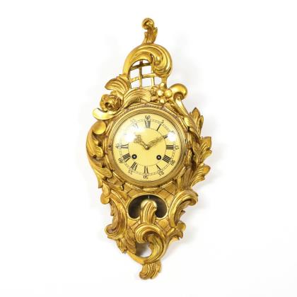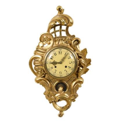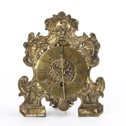 Rocailliertes Gehäuse mit Rocaillen, Blumen und Blattwerk sowie verglastem Pendelfenster. Partiell leichte Defekte.