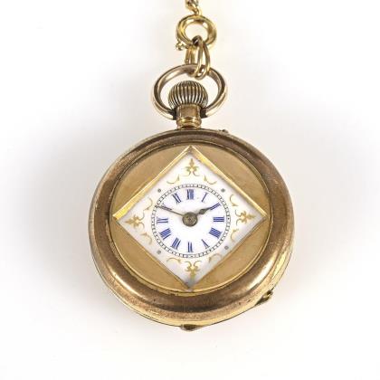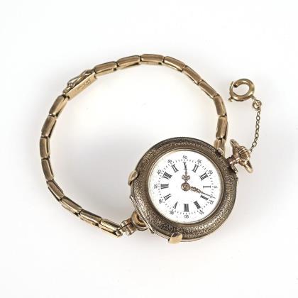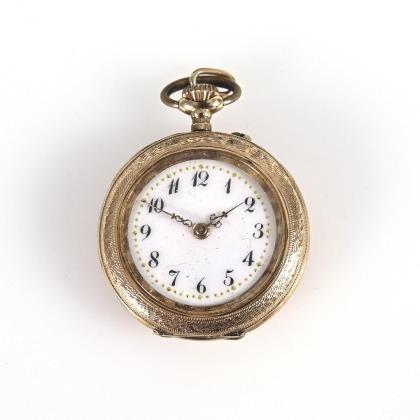 Gehäuse beidseits mit flächendeckendem floralem Dekor. Metall-Innendeckel, vergoldetes Brücken-Ankerwerk, Breguet-Spirale, 15 Rubis. Weißes Emailzifferblatt, schwarze römische und arabische Zahlen, kleine Sekunde. Kronenaufzug