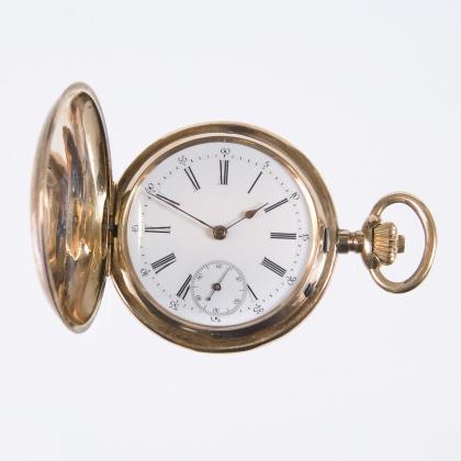 Kronenaufzug. Einschalengehäuse mit Sprungdeckel. Weißes Zifferblatt, schwarze römische Zahlen, grazile Zeiger