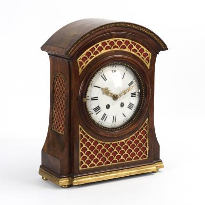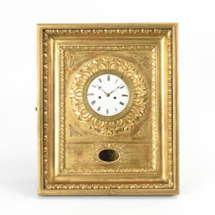 Ungemarktes Werk mit Halbstundenschlag auf Glocke, revisionsbedürftig, Schlagwerk defekt. Gewölbte Verglasung, ockerfarben lackiertes Metallzifferblatt mit arabischen Zahlen, Minutenkranz, Louis Quinze-Zeigern.