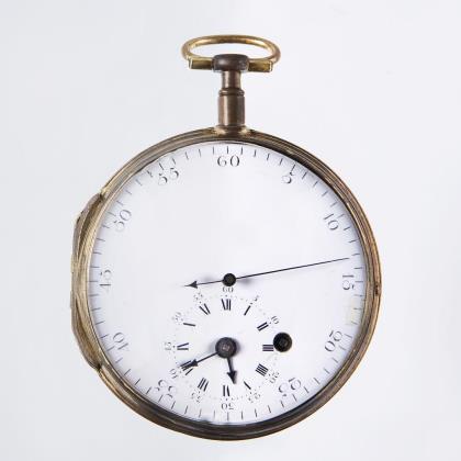 Platine signiert. Messing-Gehäuse, vergoldetes Spindelwerk mit gebläuten Stahlschrauben, Regulierzifferblatt, Kette und Schnecke, filigran gearbeiteter Kloben. Weißes Emailzifferblatt mit römischen und arabischen Zahlen. Zentrale Sekunde, dezentrale Stundenanzeige, gebläute Stahlzeiger, Schlüsselaufzug