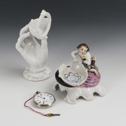 Unbemalte Hand und Amor mit Fackel. Als Zugabe 1 versilberte Taschenuhr