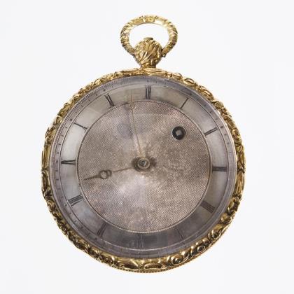 Vergoldetes Spindelwerk mit Regulierzifferblatt, Kette und Schnecke. Filigran gearbeiteter Kloben. Silbernes, im Zentrum guillochiertes Zifferblatt, römische Zahlen, grazile Zeiger. Schlüsselaufzug. Ohne Punzen, Feingehalt mit Säure geprüft
