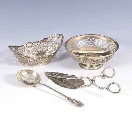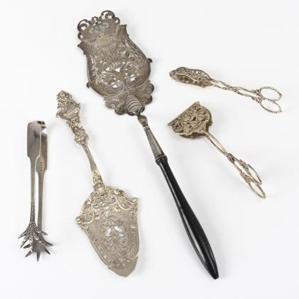 3x Silber, 1x plated: Heber, 2 Gebäckzange, 1 Zuckerzange