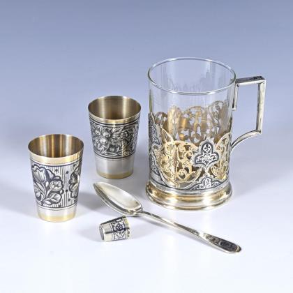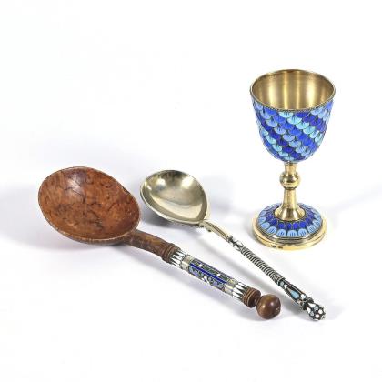 Russian vodka cup and 2 decorative spoons with enamel.