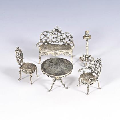 5 silver miniature furniture. Gebrüder Kühn, Schwäbisch Gmünd.