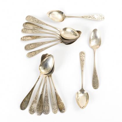 Konvolut ähnliche Kaffeelöffel mit verschiedenen Floralgravuren. Laffen teils etwas gedellt.